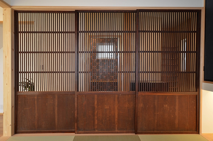K様が古民具店で買われた建具。今の住宅のサイズとは少し違うので、レールの加工に苦労しました