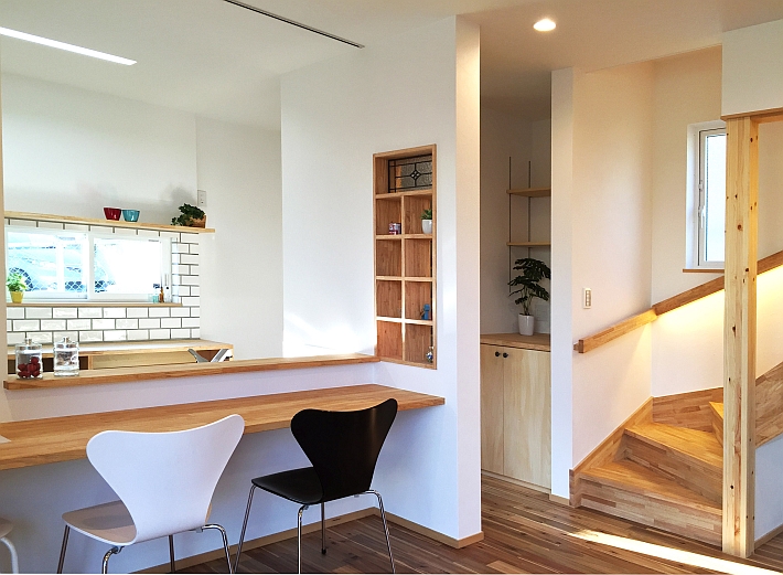 K様邸のキッチンスペース。タイルがカフェっぽい雰囲気を演出しています