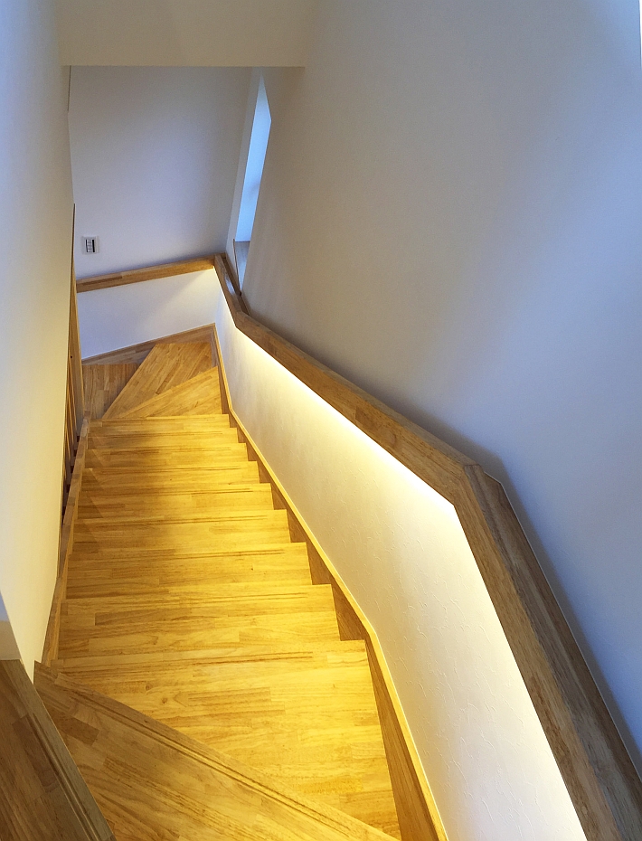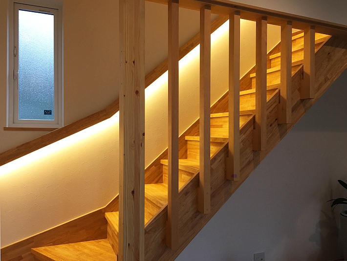 手すりの下に間接照明を入れた階段。夜見ると少し幻想的です