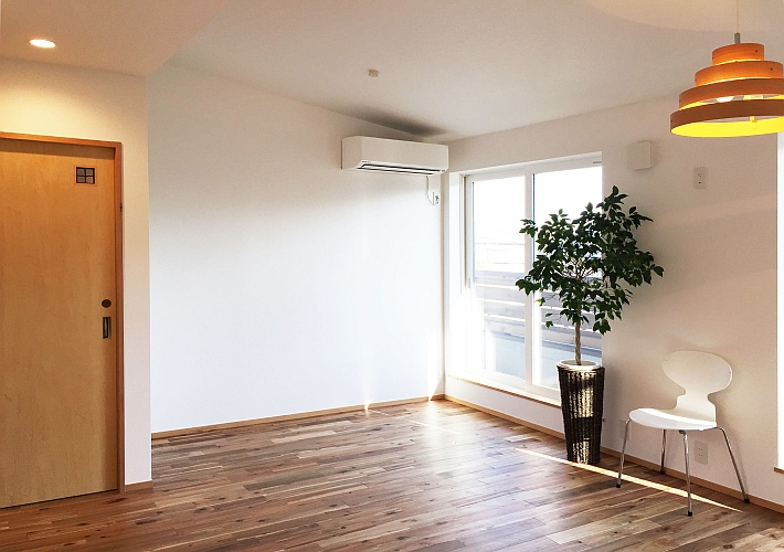 バルコニーに面した明るい子供部屋。ひと手間加えて施工したドアのステンドグラスがポイントです