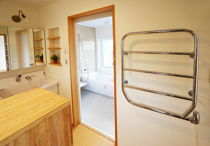 洗面室です。壁に掛かっている巨大な鍋敷きのような金具はタオルウォーマーです