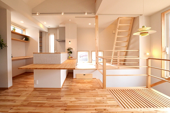 LDKの一部は小上がりの畳スペースになっています。畳の端に腰をかけるとキッチンカウンターで食事ができる高さになっています