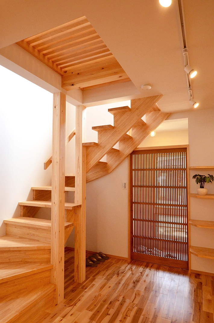 玄関から入ってきた1階のホールです。正面の建具はT様のお持ち込みの古民具です。上下のレール部分を細工して、引き戸として使用しています