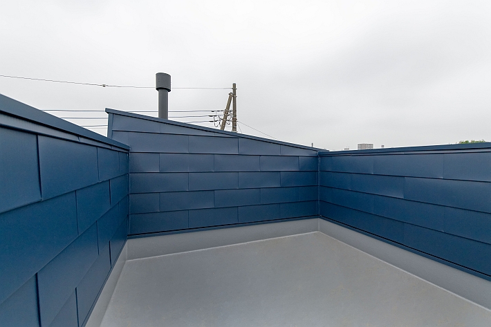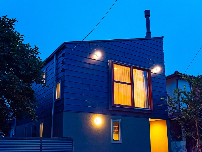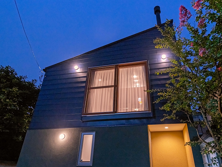 T様邸の外壁は、2階部分が一文字葺きに施工した紺色のガルバリウム鋼板。1階部分は深い緑色の塗り壁です。林間の別荘のような雰囲気です