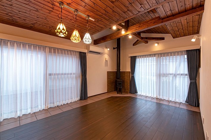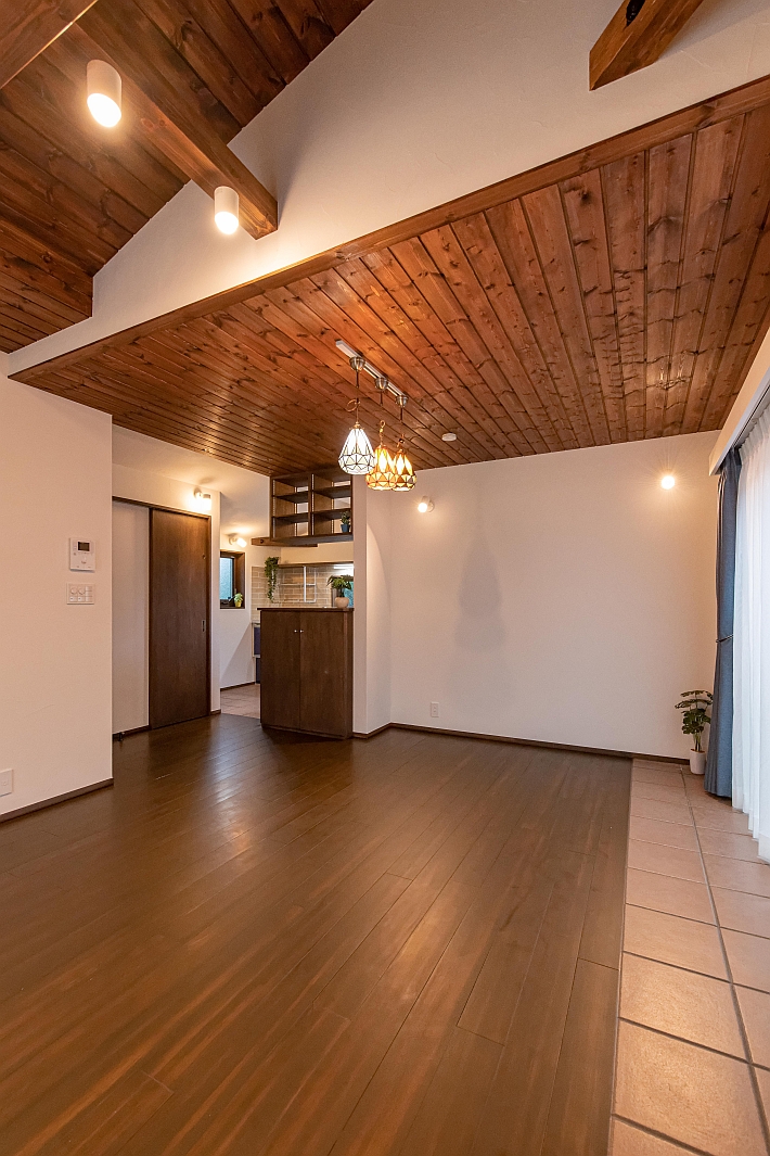 別角度から撮影したT様邸のリビング。床と天井はロッジポールパインの無垢材を同じ色で塗装して仕上げています。床一面に無垢材を敷き詰めず、窓際にタイルを敷いたのはT様のアイデアです
