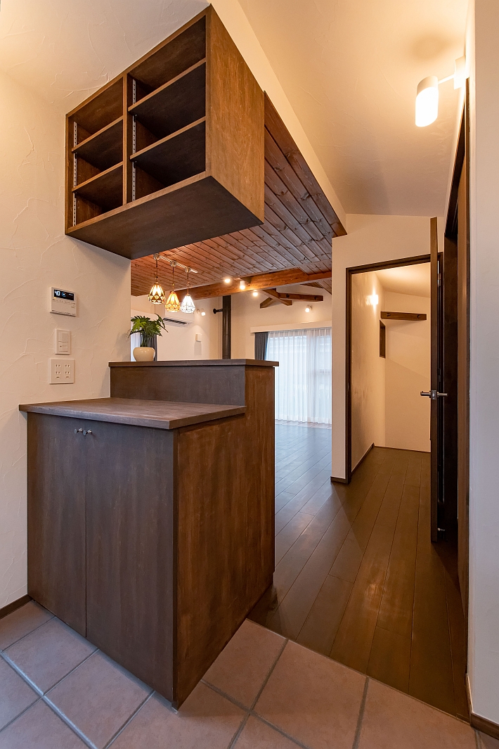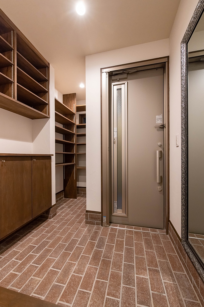 たっぷり収納できるシューズクロークはすべて造作したもの。T様邸の玄関スペース