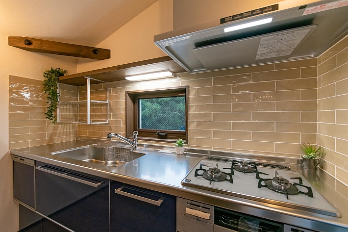 カフェオレカラーのタイルと紺色の組み合わせが落ち着いた印象のキッチン
