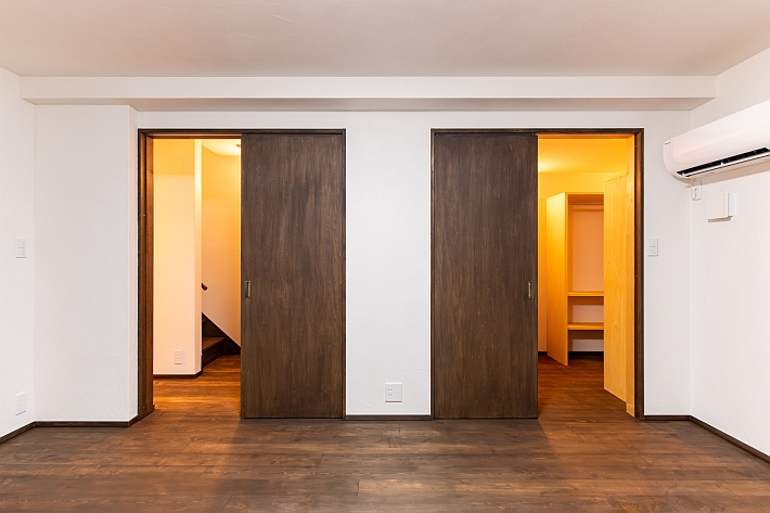 T様邸の地下に設けた主寝室。右側の引き戸の向こうはウォークインクローゼット。左側の引き戸の向こうは1階に上がる階段と納戸と階段下収納になっています