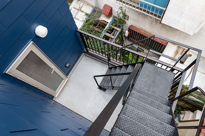 屋上のルーフバルコニーから2階バルコニーを撮影しています
