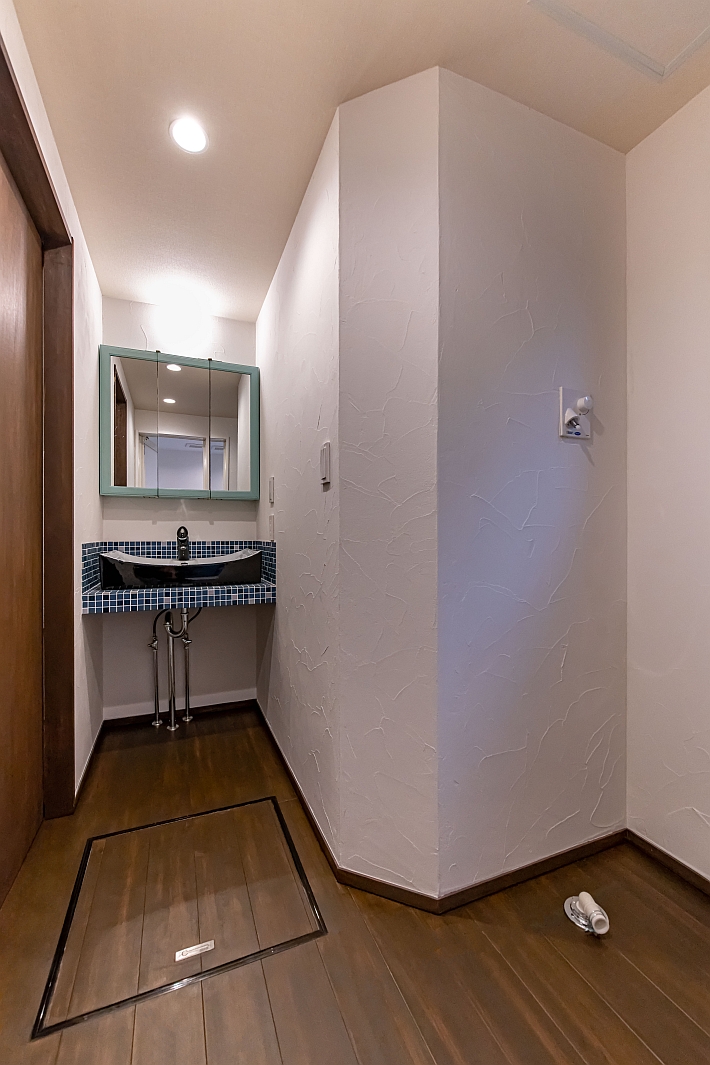 1階の洗面スペース。ミラーも洗面ボウルもT様のお持ち込み品を取り付けています。この写真がわかりやすいのですが、T様邸の室内の壁はすべて珪藻土のコテ塗りで仕上げています
