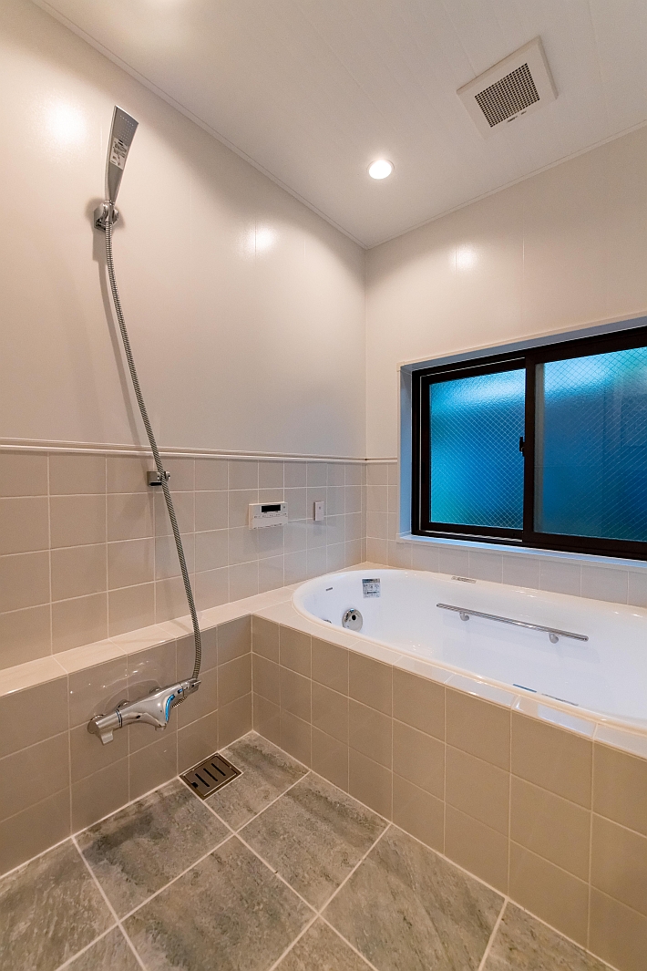 TOTOのスーパーエクセレントバスを設置した在来浴室。「強力なジェット水流の浴槽が欲しい」というご主人のリクエストを叶えるにはユニットバスでは無理でした