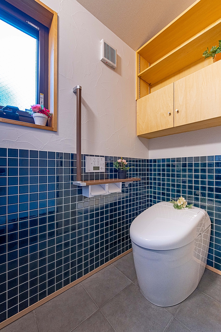 目の覚めるようなモザイクタイルを施工したトイレルーム。清潔感があってステキです