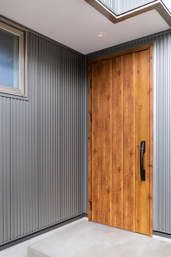 A様邸の玄関前エントランスです。玄関ドアはYKK APのヴェナートです。木目調のドアとガルバリウムの外壁材は意外に相性が良いです。
