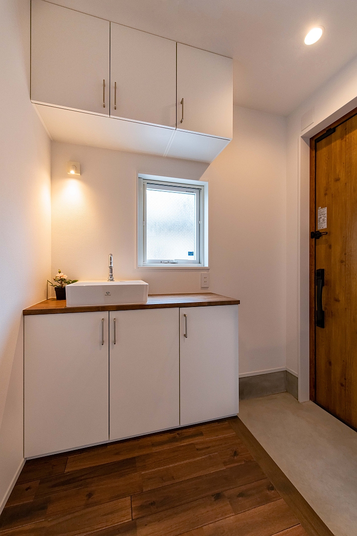 A様邸の玄関内側です。シューズボックスの上の手洗いですが、リクシルの既製品のシューズボックスの天板に穴を開け配管を通して造作した、オリジナルのシューズボックス兼洗面台です。