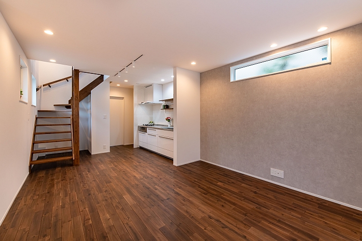 別の角度から撮影したLDKです。床材にはアカシアの無垢材を使っています。キッチン側面の壁は耐震等級3を取得するために設けた耐力壁です。