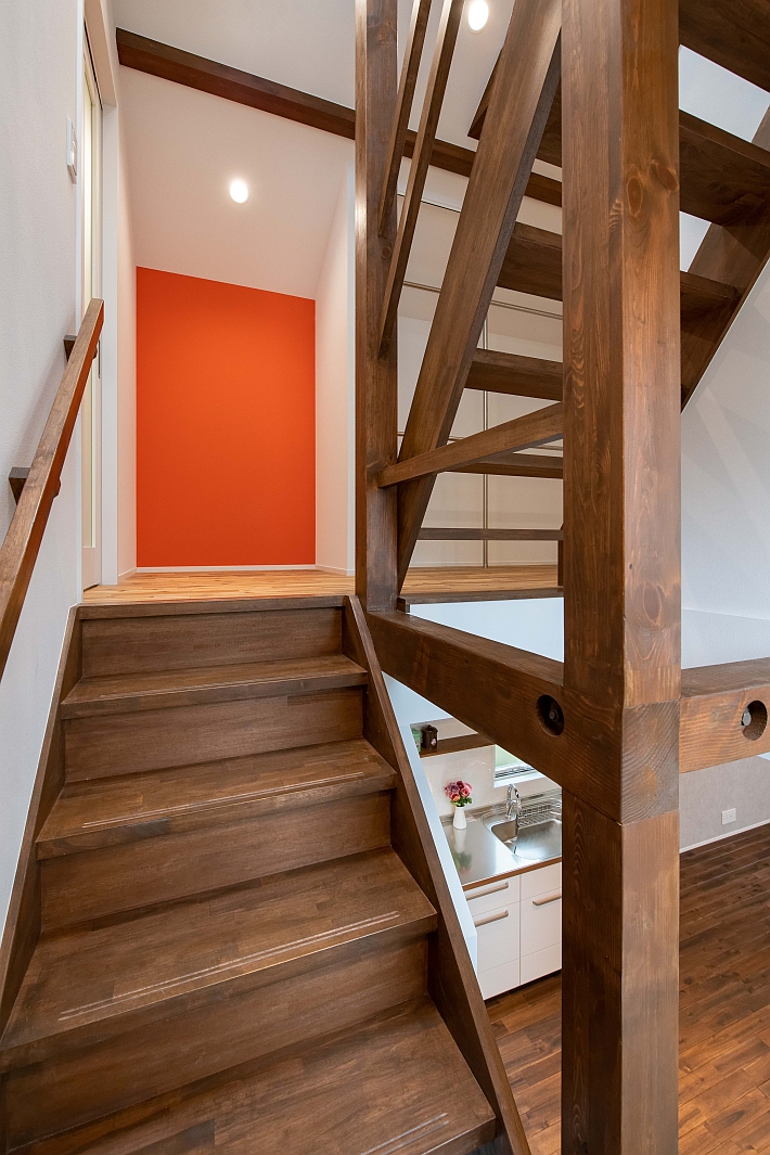 階段を上がって2階ホールの写真です。正面に目の覚めるようなオレンジのアクセントウォールを施工しています。