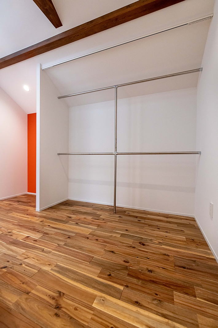 上の写真のパイプハンガーを背にファミリークローゼットを撮影しました。