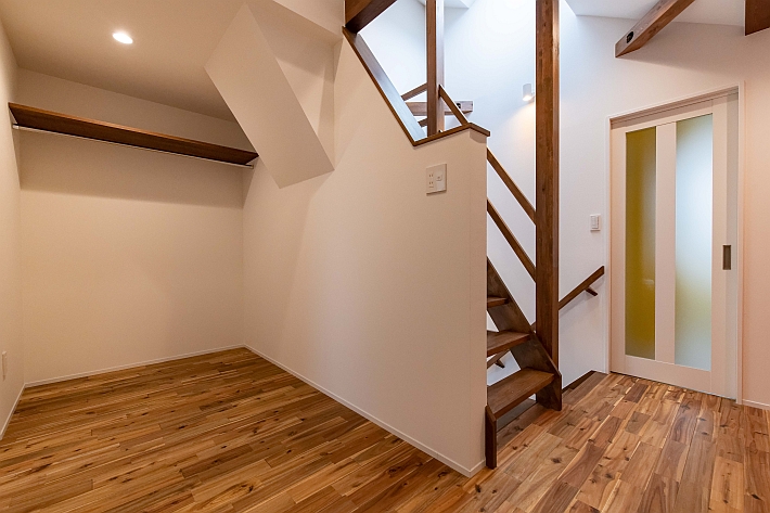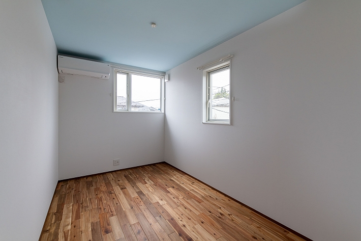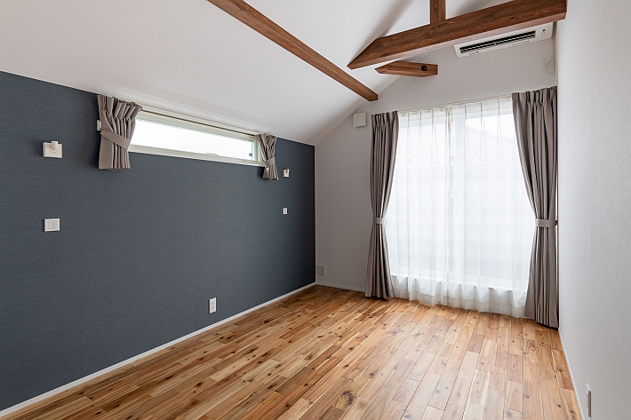 主寝室。2階の床も1階と同じアカシアの無垢材を施工しています。