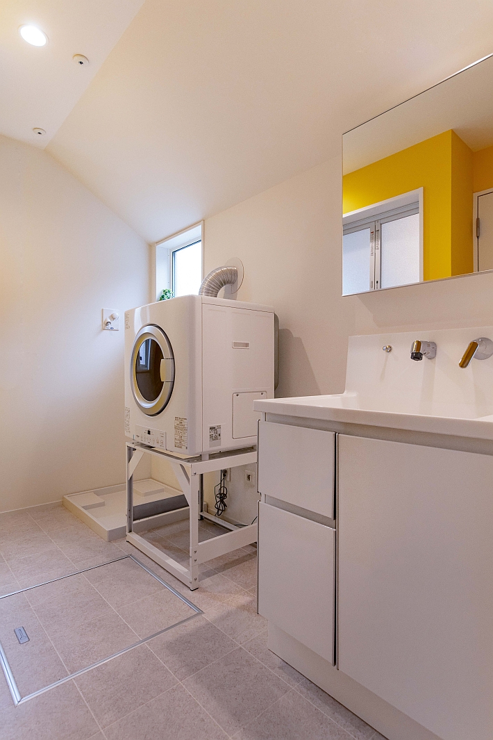 白を基調にした清潔で明るい洗面脱衣室です。中央にガス乾燥機の「乾太くん」があります。洗濯機の乾燥機能とは別次元の乾燥能力があるので、おすすめです。