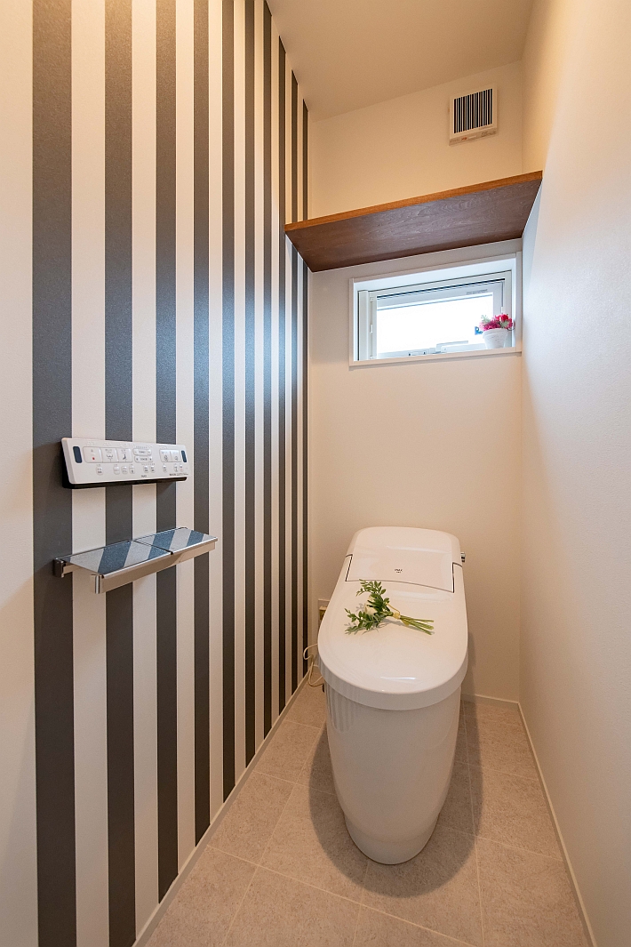 ストライプ柄のクロスが印象的なトイレスペースです。