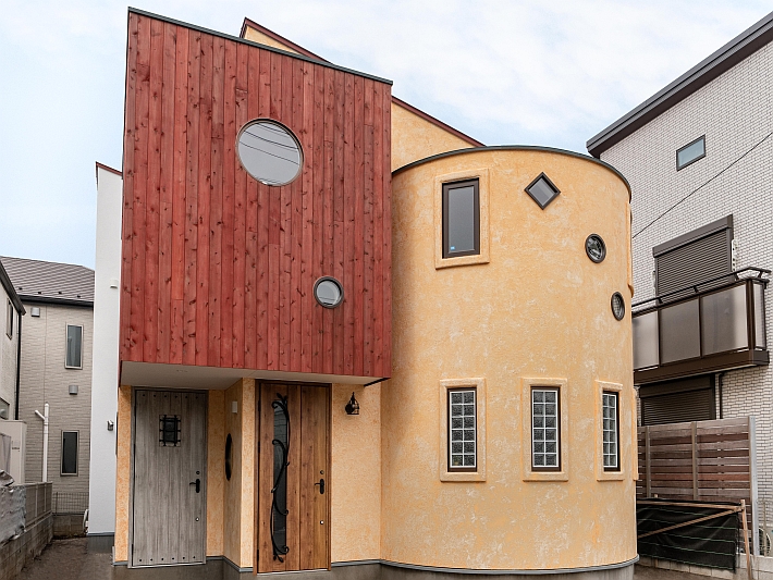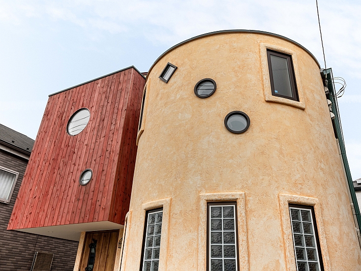 円柱部分の外壁は「ガルデ」という大理石を主成分にした塗り壁材の上から、黄色い塗料を重ね塗りしています。単純に重ね塗りするのではなく、塗った後、布で塗料を軽く拭き取ることで、アンティークな雰囲気を作り出しています。