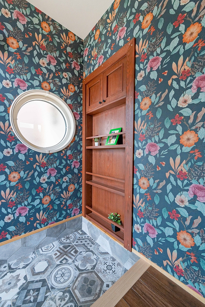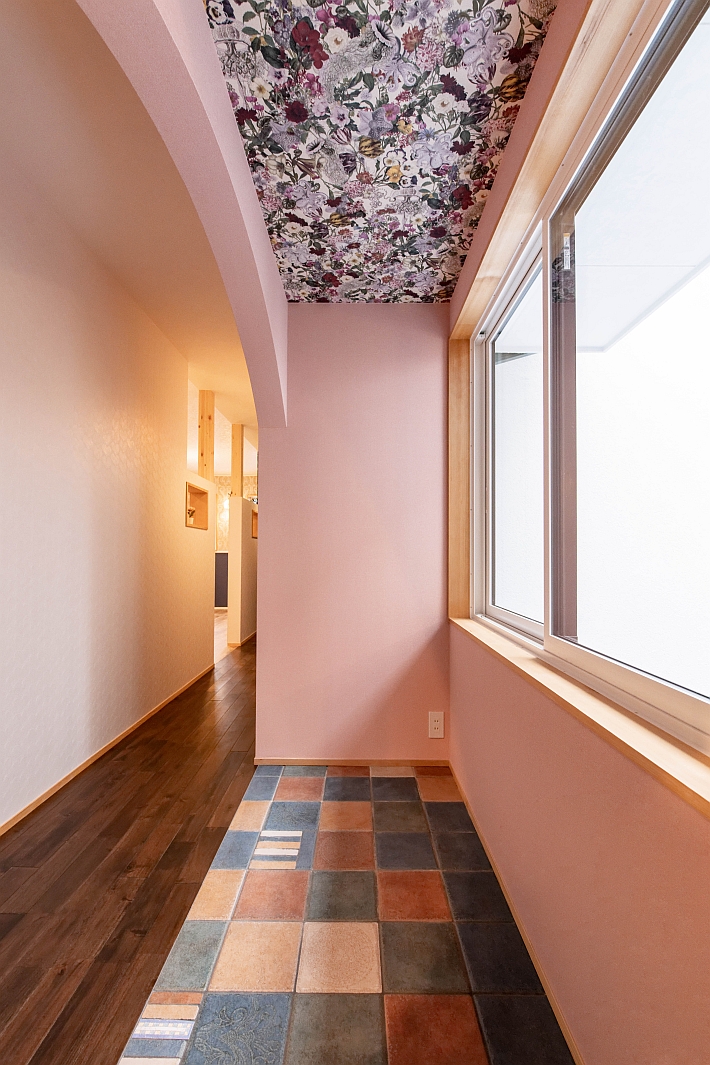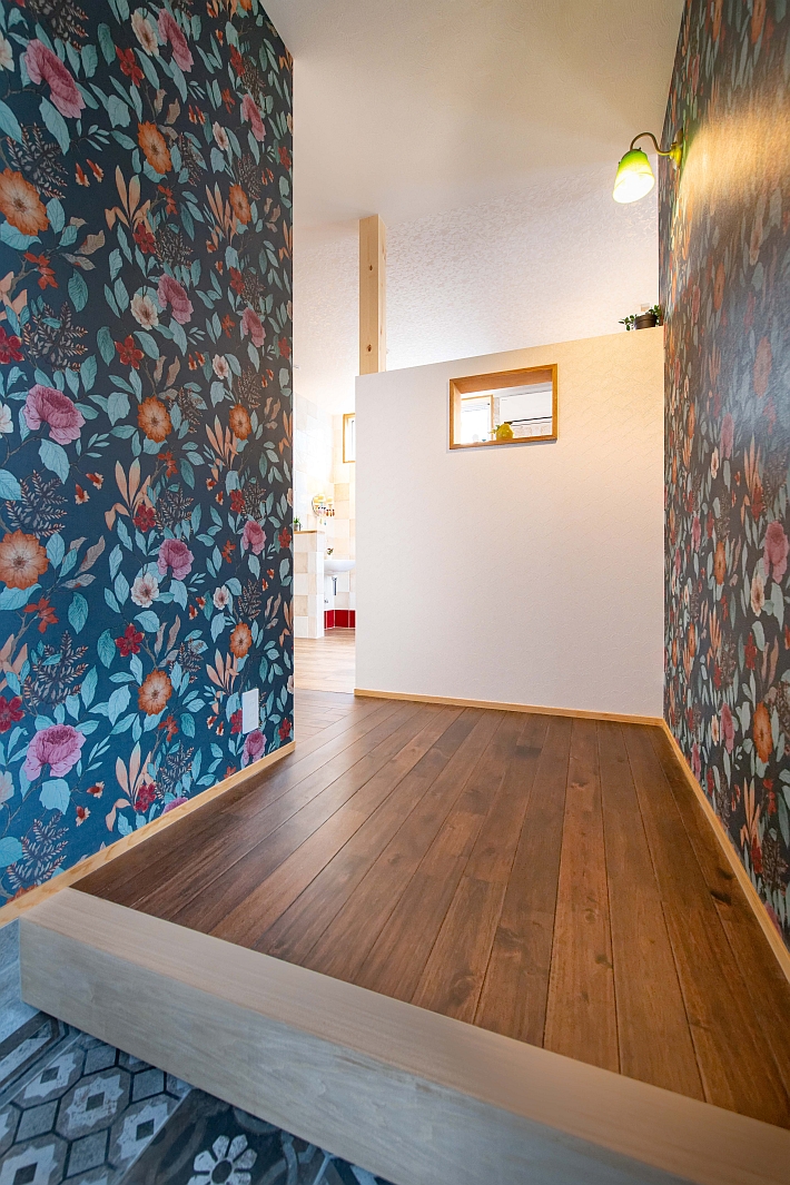大きな花柄の壁紙が印象的な1階の親世帯の玄関ホールです。