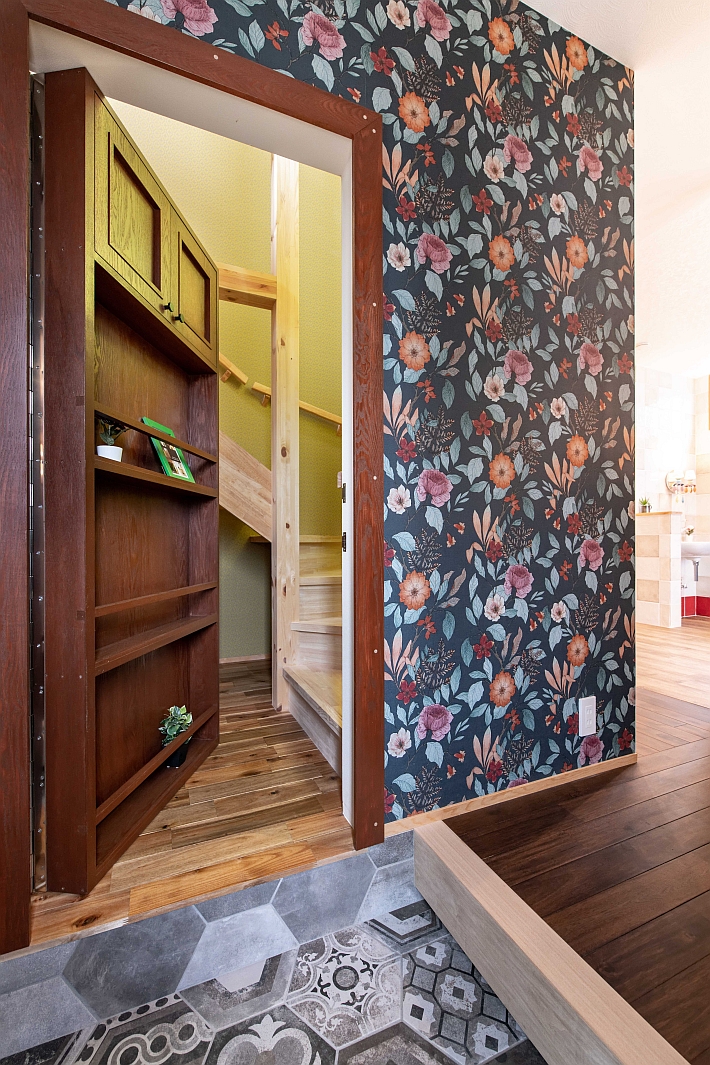 扉を開けた向こう側は子世帯の玄関です。忍者屋敷のような、あるいはハリーポッターの映画に出てくるような遊び心のある仕掛けです。O様のアイデアを元に弊社で造作した扉です。