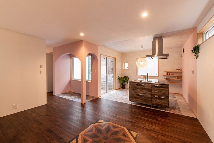 中庭に面した明るい1階LDK。床の星型の模様は、「モザイクパーケット」というフローリング用の寄木細工です。
