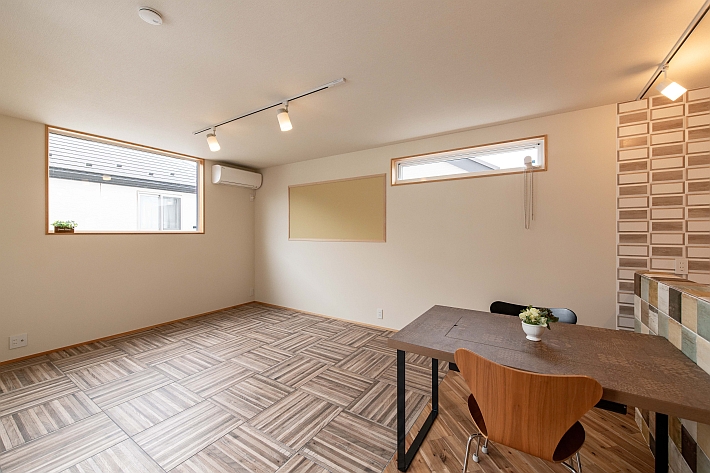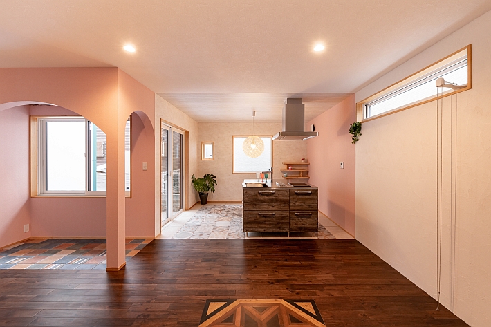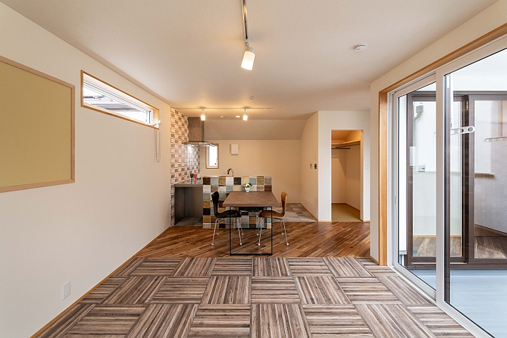 バルコニーに面した2階のLDK。手前の木を組み合わせたような床材はアドヴァン社のタイルです。