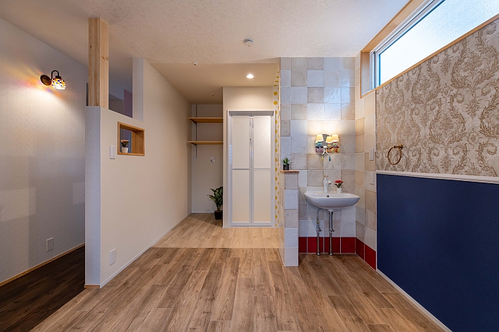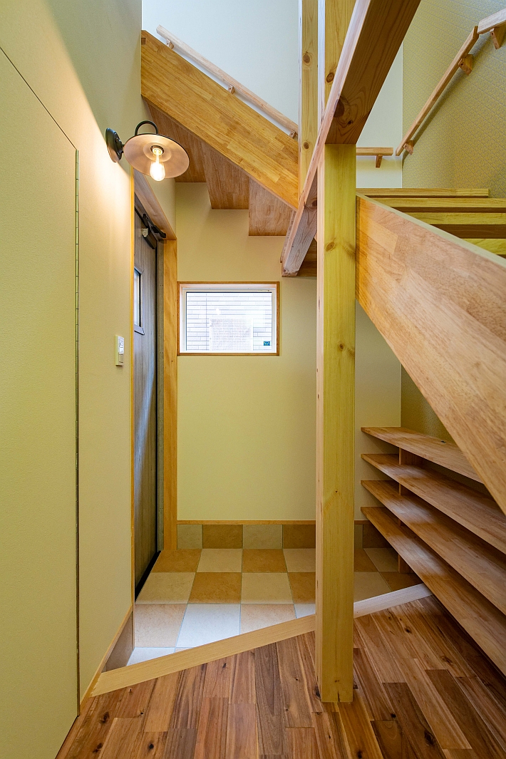 ここからは子世帯の写真になります。まずは古民家風の趣きの玄関ホール。左の壁に蝶番が見えますが、これは先ほど紹介した本棚風扉の裏側です。