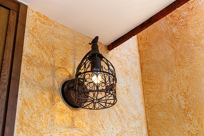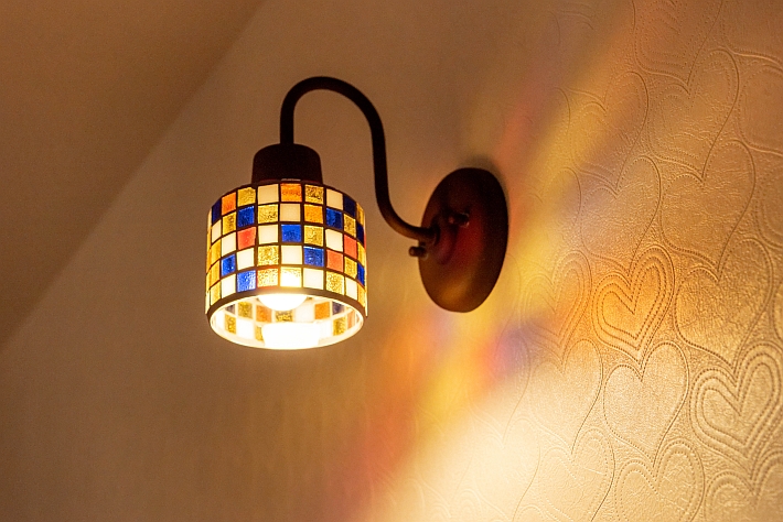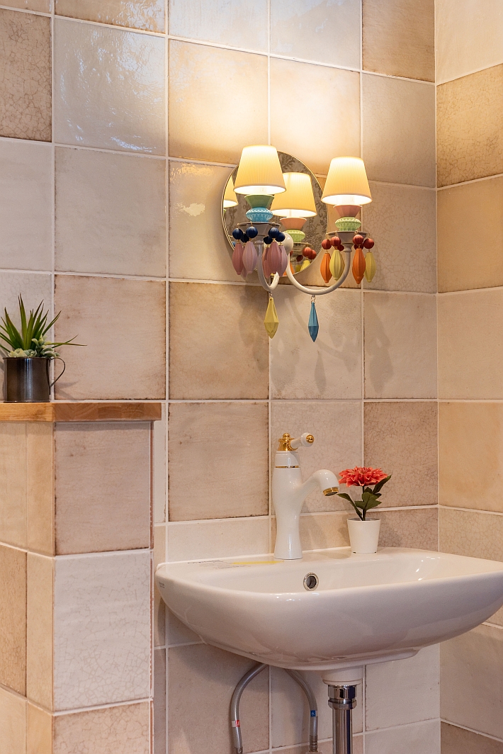 手洗いスペースに設置したスペイン製のミラー一体型の照明器具。LLADRO(リヤドロ)社のDELLE DE NUIT(夜の美女)というシリーズの製品です。