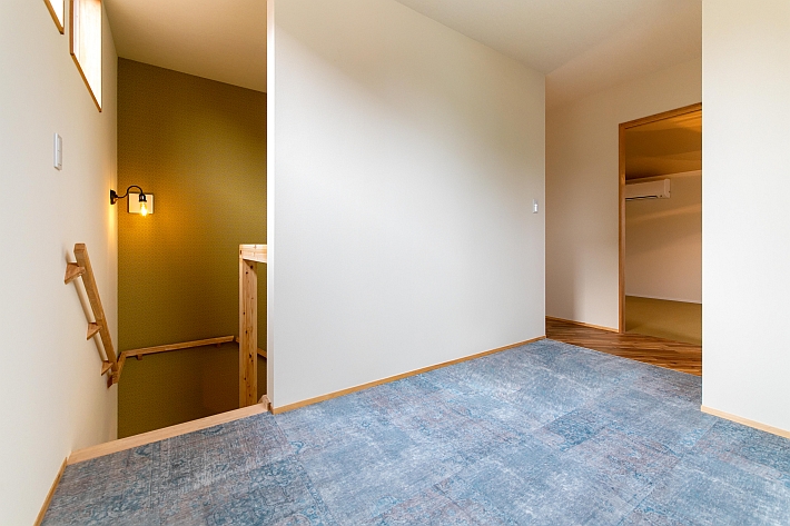 もう一枚、別角度から。黄色系の壁紙と鮮やかなグリーンの壁紙を貼り分けています。