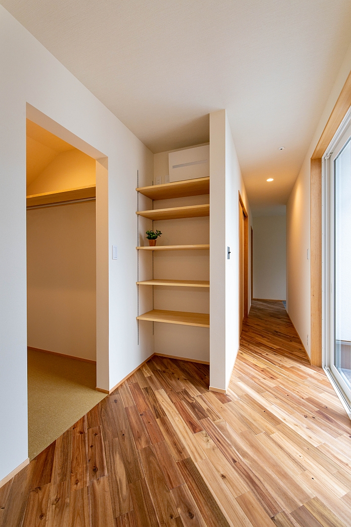 2階のバルコニーに面した廊下。床は斜め張りにしたアカシアの無垢材です。