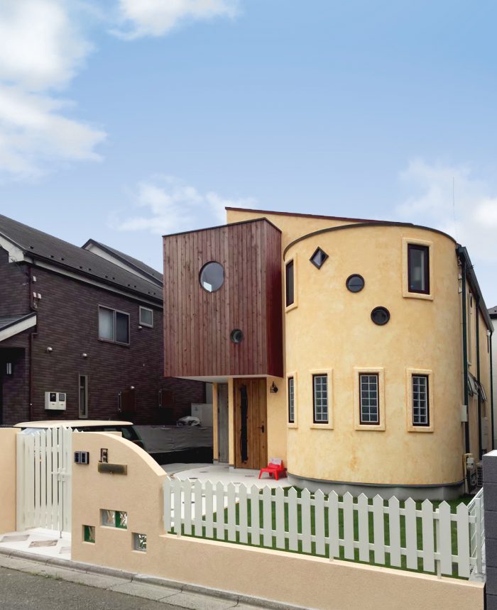四角形と円柱を組み合わせた個性的なO様邸の外観。完全分離型の二世帯住宅なので、玄関も2つあります。