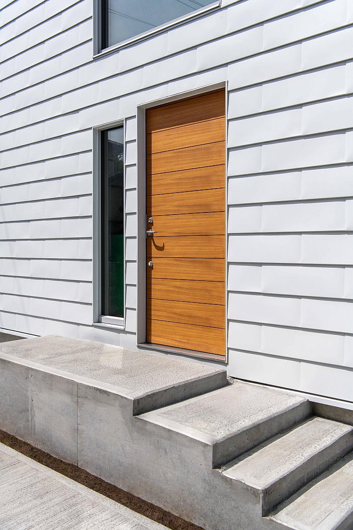 玄関には木製の断熱玄関ドア「スウェーデンドア」を採用しています。ホワイトのガルバリウム鋼板は一般的な縦葺きではなく、横葺きにしています。
