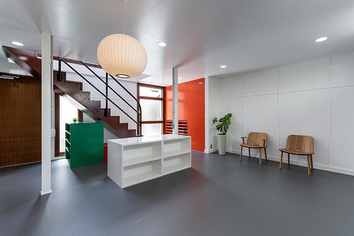 カラフルな家具が並ぶ階段下のスペース。大きな窓から、日差しが燦々と降り注ぎます。