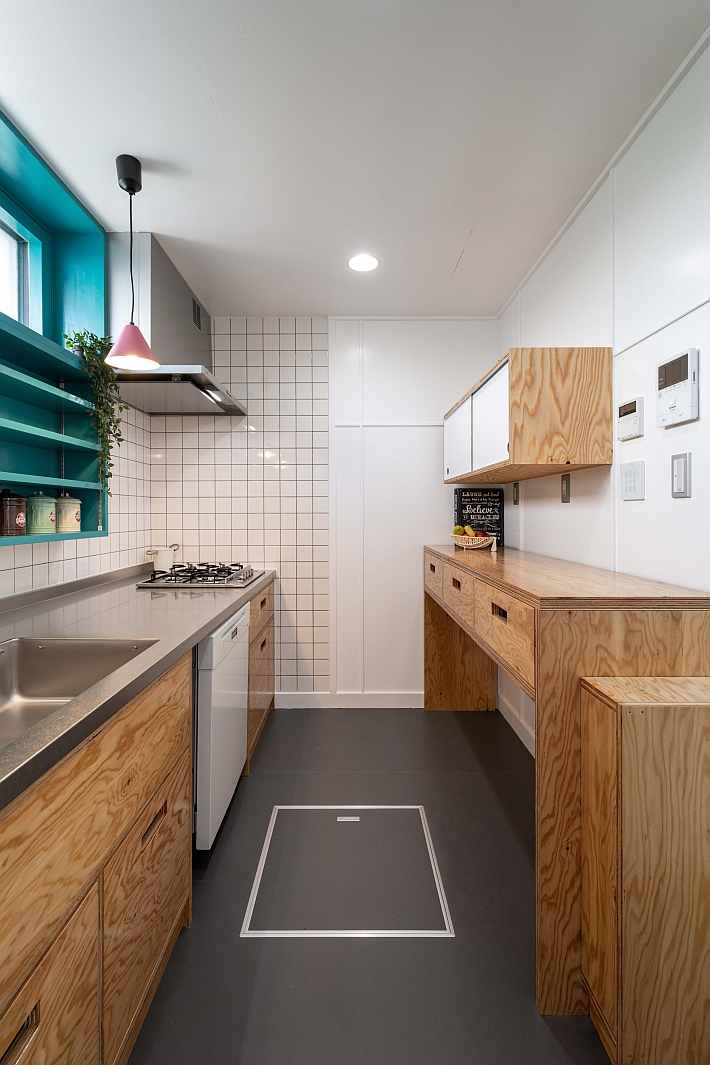 キッチン天板はシンク一体型のステンレス製です。中央の白いボックスはミーレの食洗器です。キッチン正面のブルーグリーンの棚と背面カウンターも造作しています。ピンク色のかわいらしい照明はH様からの支給品です。