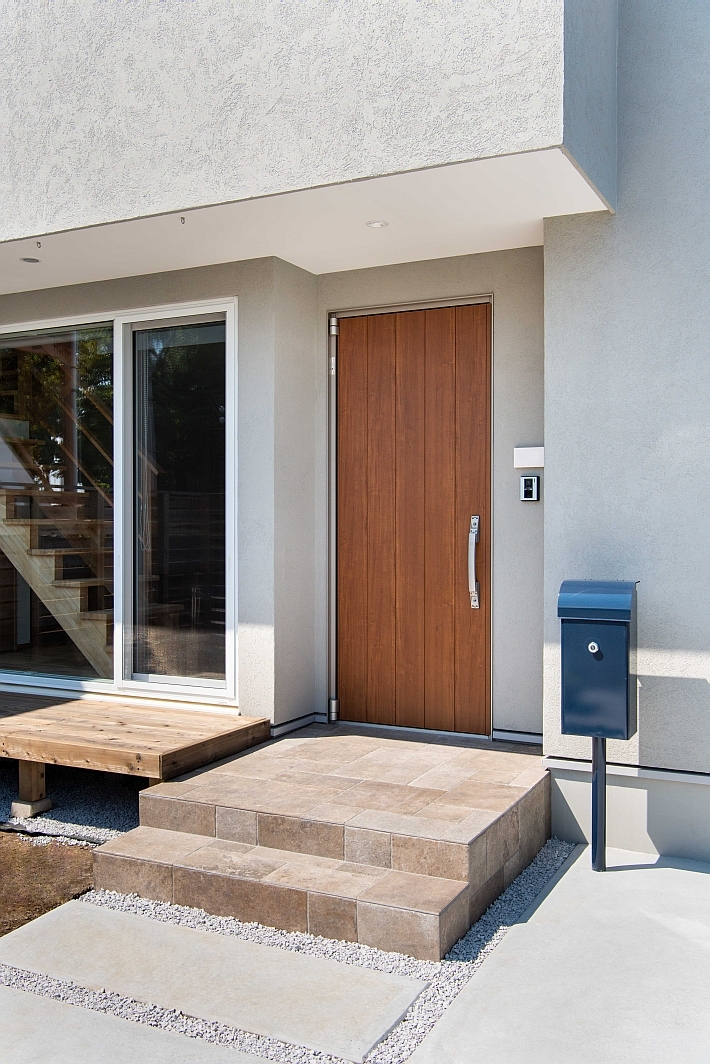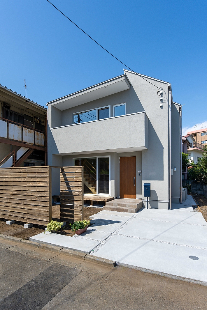 外壁には薄いグレーの塗り壁材「ガルデ」を使用。ガルデは天然の大理石を主成分にした塗り壁材。手前の目隠しのウッドフェンスは、無垢の杉板を使って造作しています。