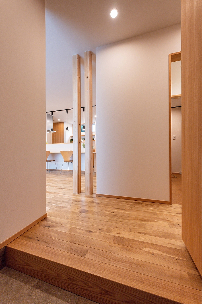 M様邸の玄関ホール。左手がLDK。右奥が洗面脱衣室になっています。M様邸の1階の床材はすべて無垢のオークを使用しています。