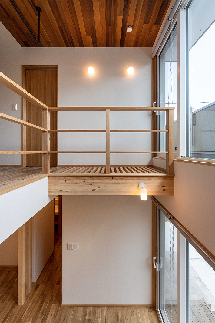 吹き抜けの天井部分にはレッドシダーを貼っています。