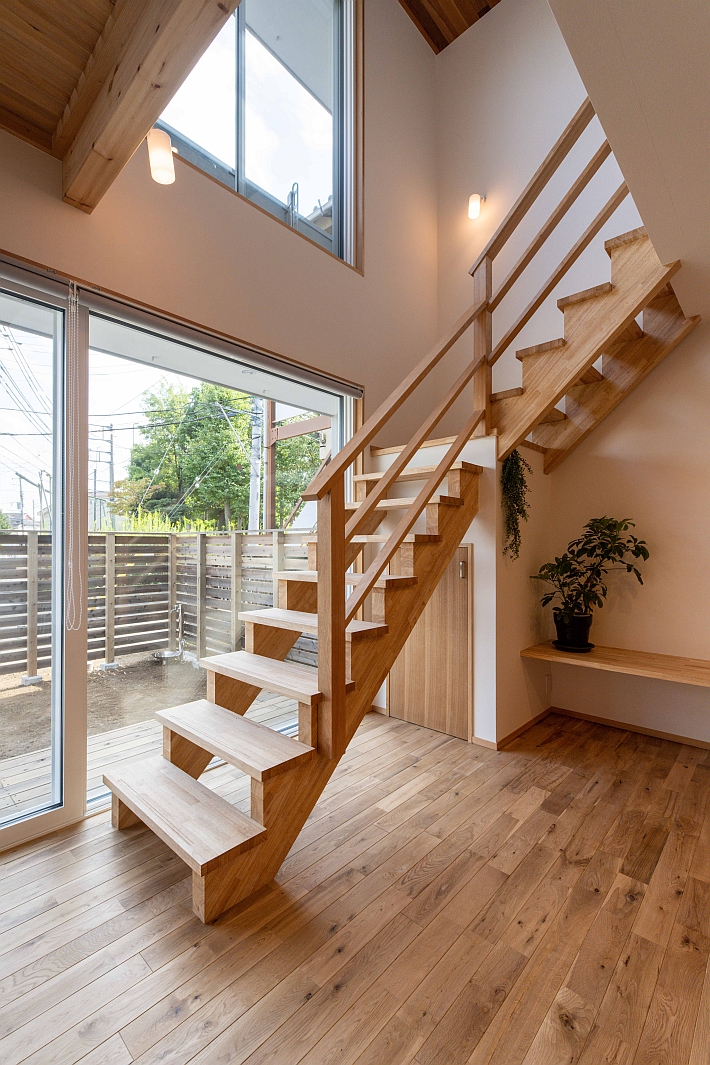 吹き抜けから明るい陽射しが入る家