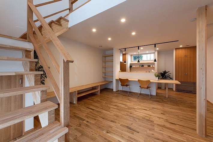 タグ:ウッドデッキ,シンプル&ナチュラル,スケルトン階段,対面キッチン,床下エアコン,書斎,渡り廊下,無垢材,造作家具