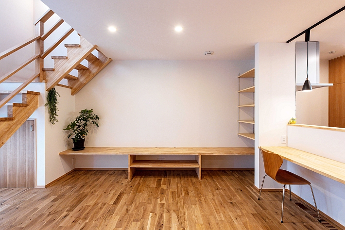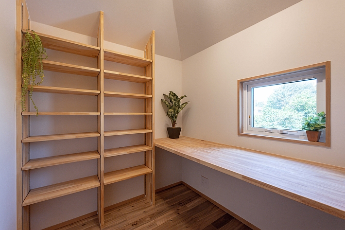書棚とカウンターを造作した書斎兼テレワークルーム。