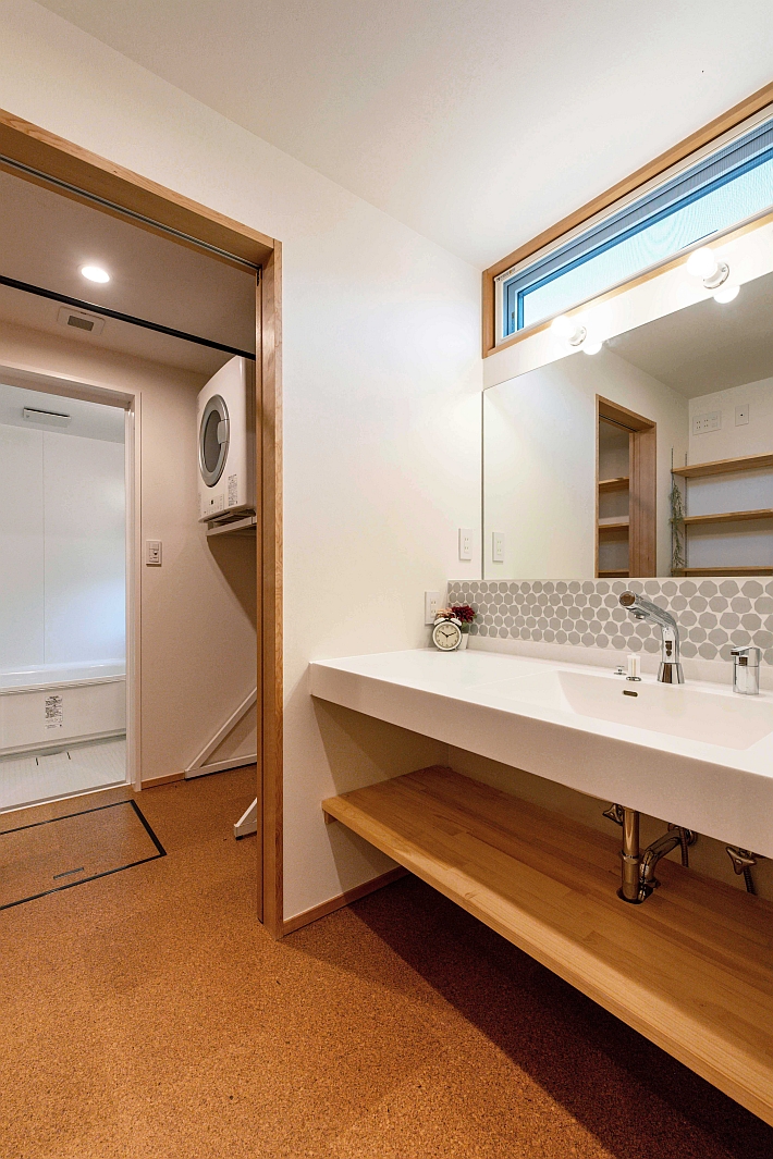 ガス乾燥機の「乾太くん」のある洗面脱衣室。洗面カウンターは造作しています。