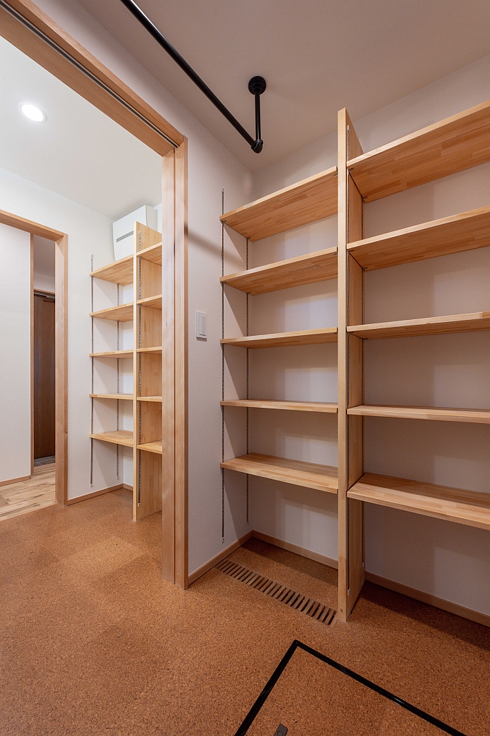 2階ホールの後ろ側に設けたファミリークローゼット。干して、すぐ収納することができる動線です。ちなみにM様邸の2階の床はすべてアカシアの無垢材です。