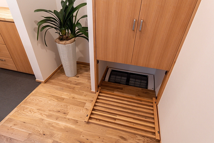 最後に床下エアコンを紹介しておきます。キッチン横の収納の下に設置しています。床暖房と違って、浴室の下も、トイレの下も、廊下の下も、家全体を床下から暖めることができるのでオススメです。
