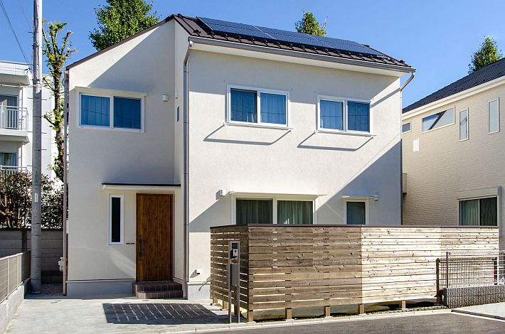 M様邸の外観です。外壁には天然大理石を主成分にした塗り壁材のガルデを使用しています。色はアイボリー。屋根の上には太陽光発電パネルを設置しています。南向きの家なので、かなりの発電が期待できます。
