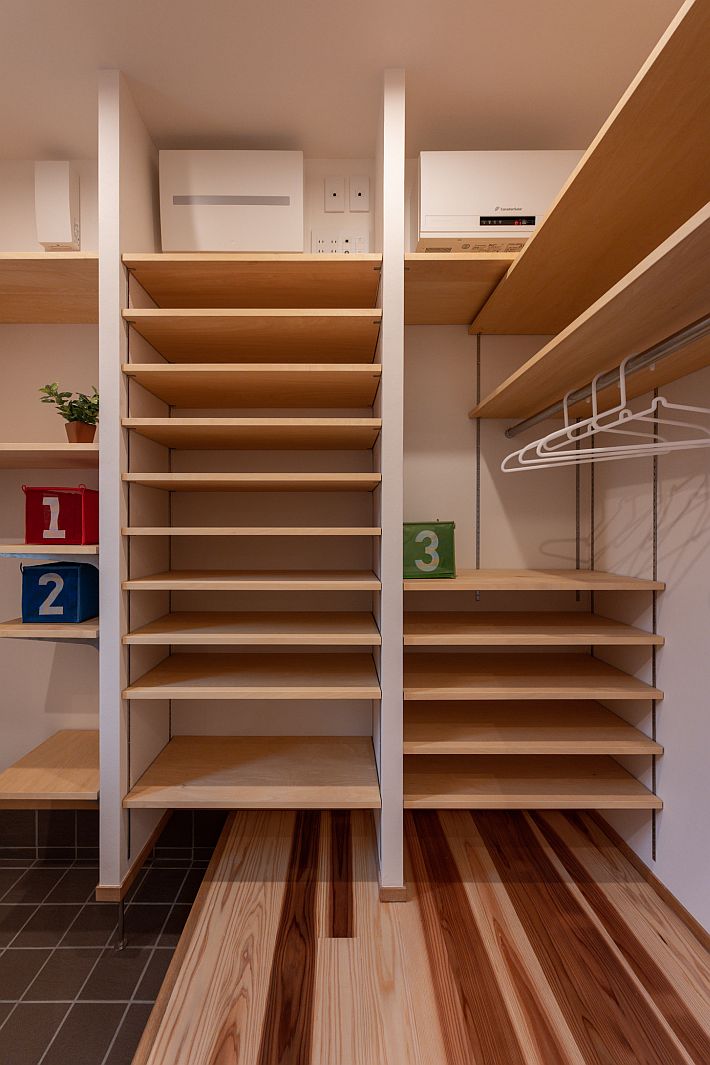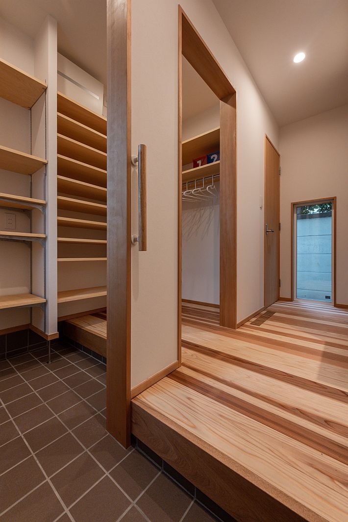 もう一枚、玄関と土間収納の写真です。玄関ホールの正面には縦長のFIX窓を設置しています。将来、裏庭に植栽することで、緑の額縁のようになります。
