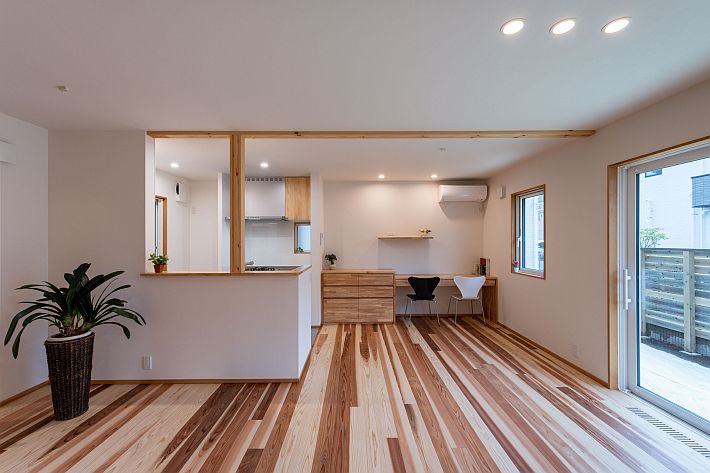 1階南側に面したLDK。左奥はキッチンです。M様の床材には、1階も2階も無垢の杉板を使用しています。紅い木肌と白い木肌が混在していますが、1~2年経つと、全体的に飴色に変化して、色の違いがあまり目立たなくなります。