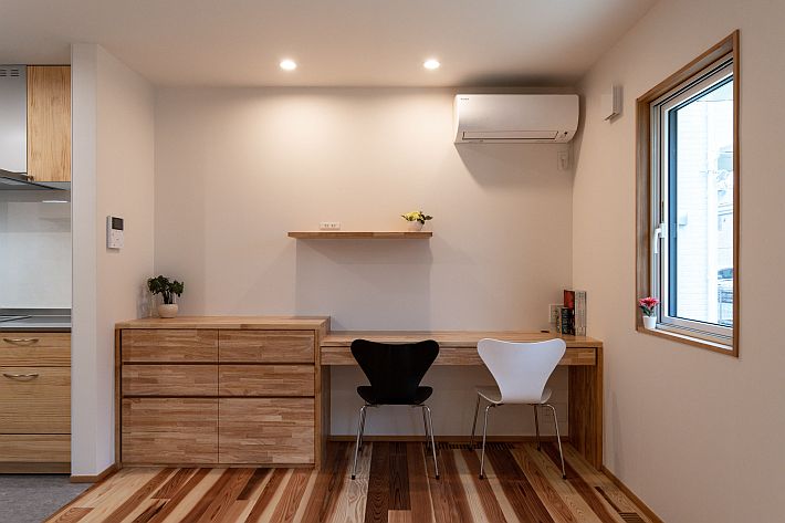 キッチン横の造作収納棚と造作お勉強カウンター。